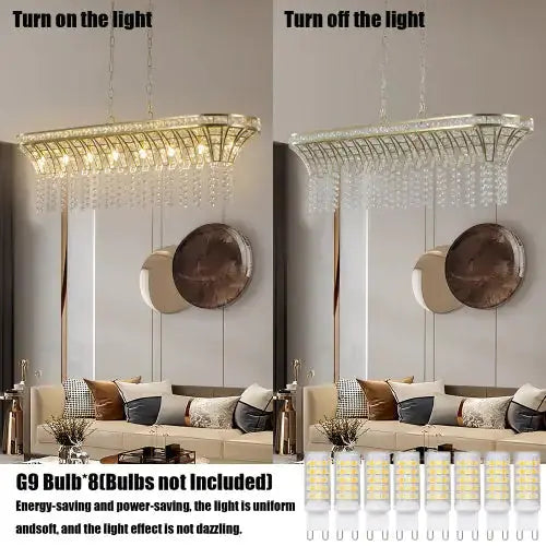 The clever combination of metal and crystal, the minimalist shape is full of art and can decorate the whole room and make the whole room bright. Ideal décor A luxurious, elegant, modern industrial retro design that adds a pop of color to your space. This crystal lamp is the best element to create an atmosphere of relaxation and peace, put it in the room and you will get a stunning romantic and charming atmosphere. (Consists of a sand-gold iron lamp body and a K9 crystal.) With the 39.37-inch suspension chain, you can adjust the height according to your floor height. It requires 8 G9, 40-watt halogen bulbs. This product does not contain a light source